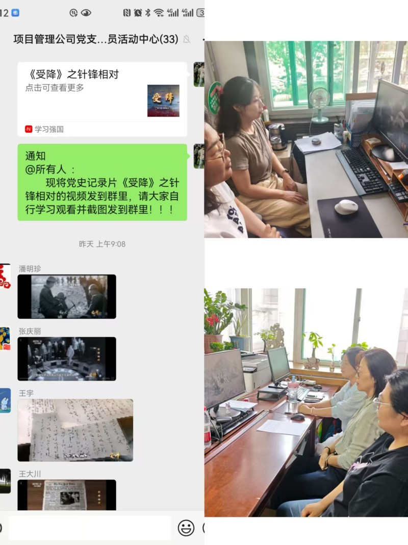 9月1日,項(xiàng)目管理公司黨支部開展“重溫歷史 奮勇爭(zhēng)先”主題活動(dòng)?;顒?dòng)中,全體黨員干部共同觀看黨史紀(jì)錄片《受降》,紀(jì)錄片以詳實(shí)的史料、珍貴的影像生動(dòng)展現(xiàn)中國共產(chǎn)黨始終以人民利益為根本,在復(fù)雜形勢(shì)下堅(jiān)守信仰、運(yùn)籌帷幄的政治智慧和使命擔(dān)當(dāng),引導(dǎo)黨員干部不斷加強(qiáng)黨史學(xué)習(xí),切實(shí)把優(yōu)秀歷史經(jīng)驗(yàn)轉(zhuǎn)化為推動(dòng)工作的實(shí)際行動(dòng)。
