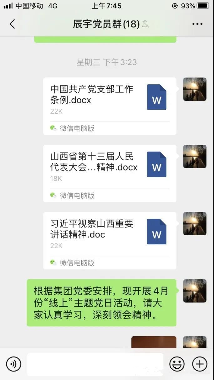 此次活動為線上學(xué)習(xí),黨支部統(tǒng)一將《中國共產(chǎn)黨支部工作條例(試行)》《山西省第十三屆人民代表大會第三次會議精神》等學(xué)習(xí)資料發(fā)送至QQ群,要求全體黨員和入黨積極分子認(rèn)真學(xué)習(xí),深刻領(lǐng)會。通過此次主題黨日活動,大家紛紛表示要時刻用黨員標(biāo)準(zhǔn)嚴(yán)格要求自己,立足崗位、奮發(fā)有為,為更好地建設(shè)辰宇公司貢獻(xiàn)力量。