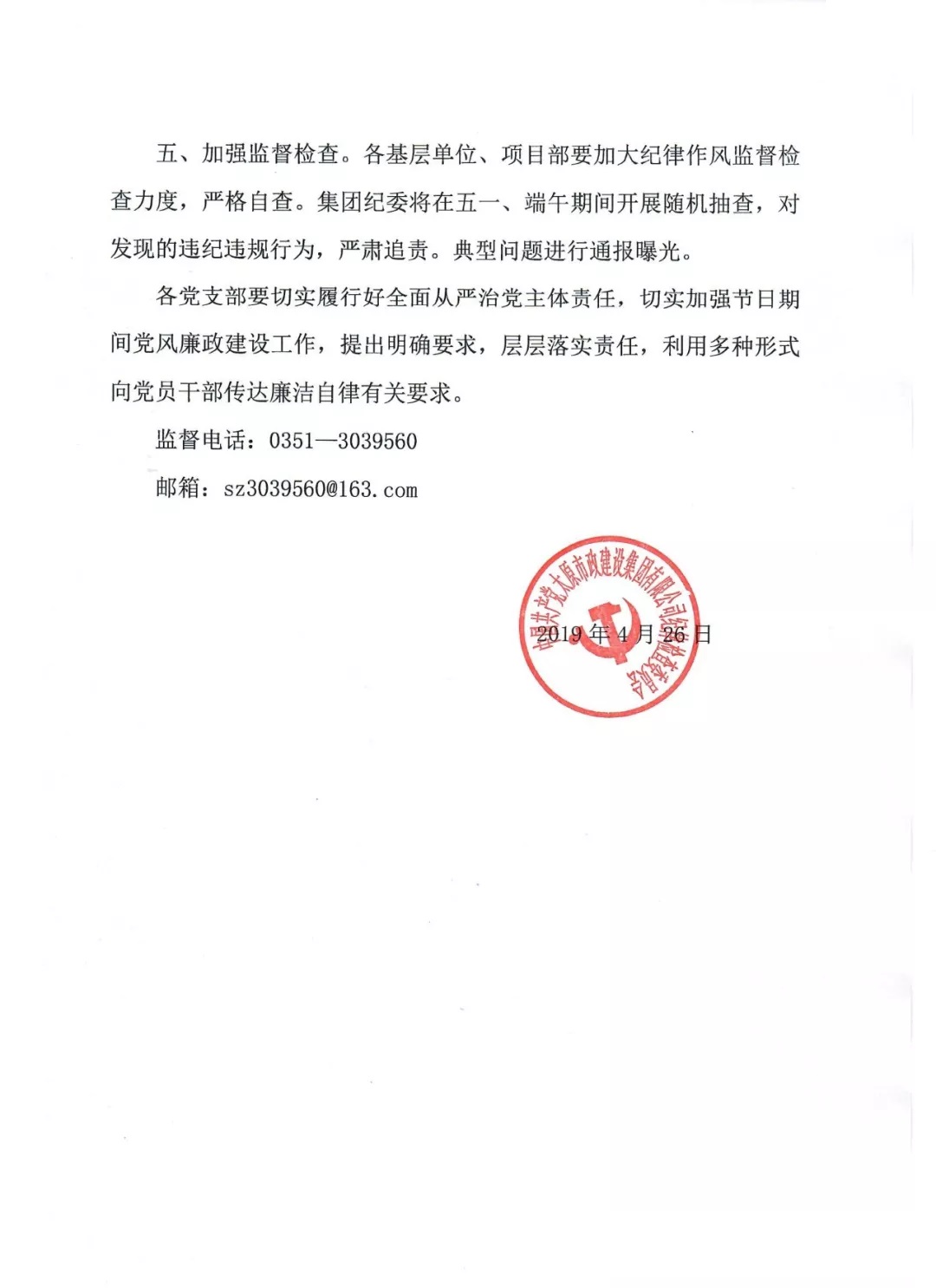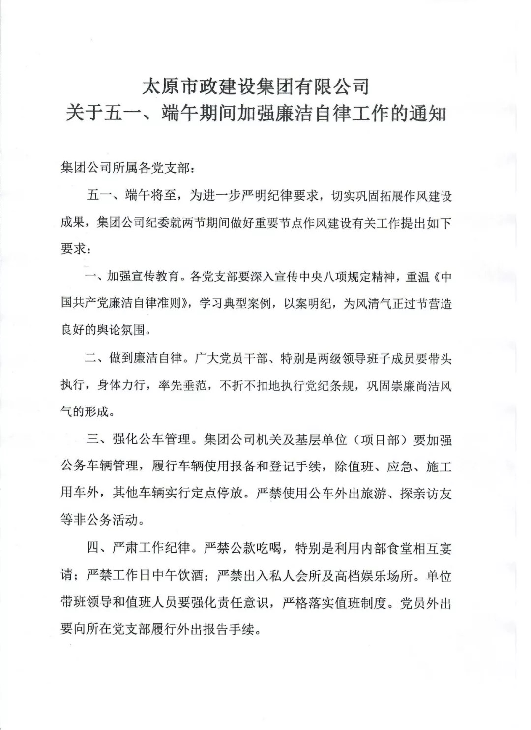 《太原市政建設(shè)集團(tuán)有限公司關(guān)于五一、端午期間加強(qiáng)廉潔自律工作的通知》