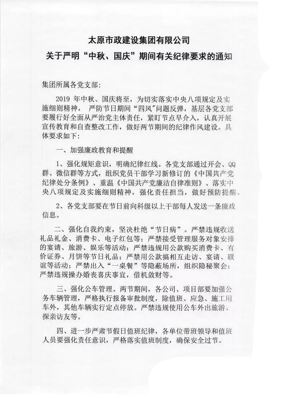 太原市政建設(shè)集團(tuán)有限公司關(guān)于嚴(yán)明“中秋、國(guó)慶”期間有關(guān)紀(jì)律要求的通知
