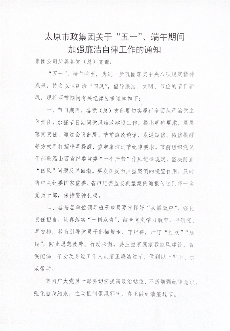 太原市政集團(tuán)關(guān)于“五一”、端午期間加強(qiáng)廉潔自律工作的通知