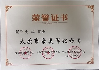 近日,太原市政集團(tuán)安裝公司辦公室主任賈璐被太原市婦女聯(lián)合會(huì)、太原市退役軍人事務(wù)所、太原警備區(qū)政治工作處評(píng)為“太原市最美軍嫂”。