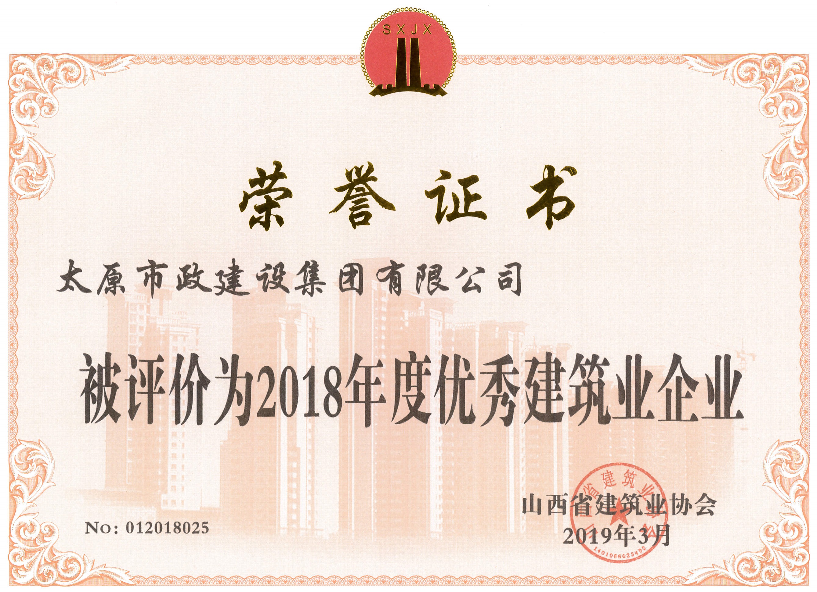 4月19日,太原市政建設(shè)集團(tuán)有限公司被山西省建筑業(yè)協(xié)會(huì)評(píng)價(jià)為2018年度建筑業(yè)企業(yè)優(yōu)秀等級(jí)。