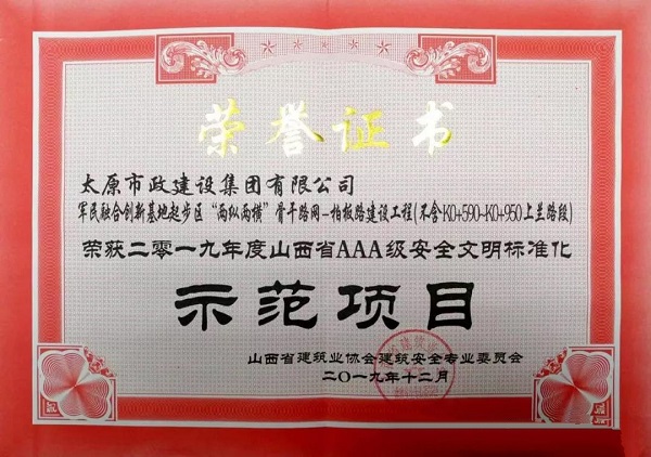 2019年12月25日,由集團(tuán)公司承建的“軍民融合創(chuàng)新基地起步區(qū)‘兩縱兩橫’骨干網(wǎng)絡(luò)—柏板路建設(shè)工程(不含K0+590-K0+950上蘭路段)”榮獲山西省建筑業(yè)協(xié)會建筑安全專業(yè)委員會頒發(fā)的“2019年度山西省AAA級安全文明標(biāo)準(zhǔn)化示范項目”榮譽(yù)稱號。