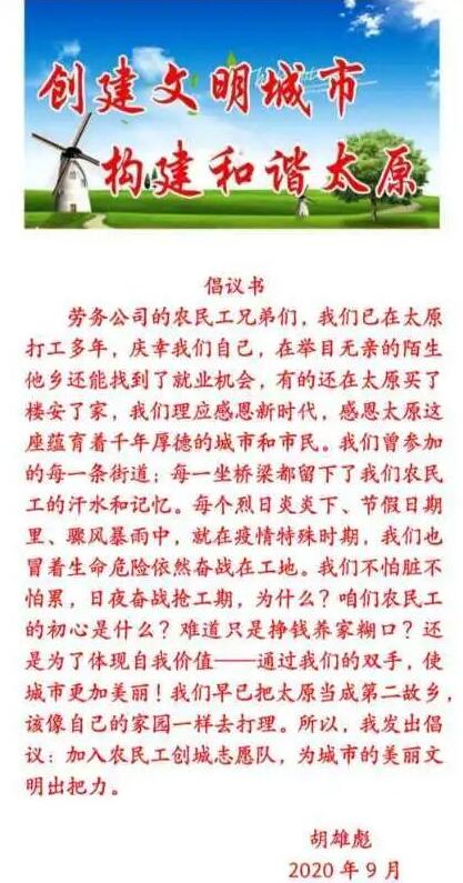 近期,太原廣播電視臺、太原日報、太原晚報等多家新聞媒體對胡雄彪和他的農(nóng)民工志愿服務(wù)隊進(jìn)行了多次報道,集團(tuán)公司也積極鼓勵全體農(nóng)民工和職工都積極行動起來,加入到創(chuàng)城活動中。