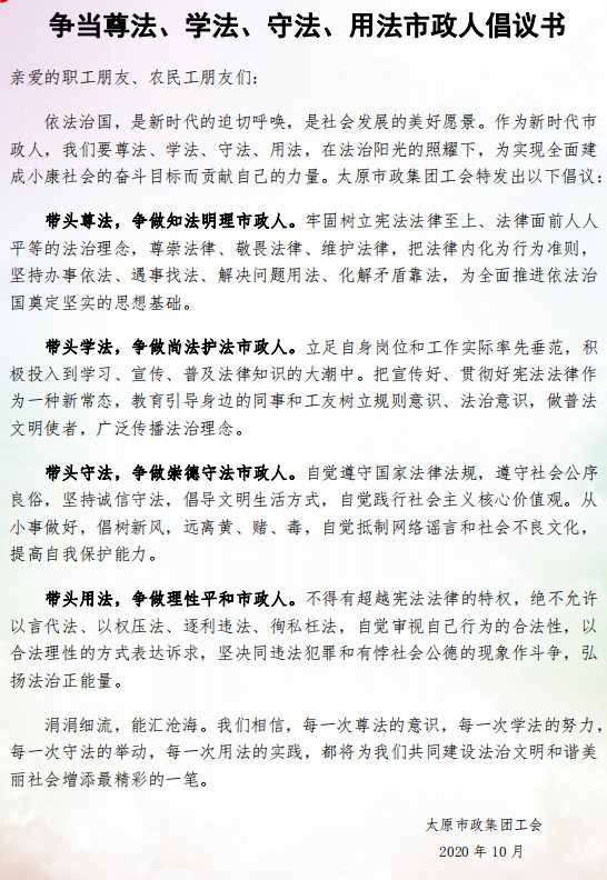 太原市政集團(tuán)在施工一線開展法律宣傳咨詢活動(dòng) 發(fā)布時(shí)間:2020-11-02 15:01:54  來(lái)源:本站  閱讀:14327