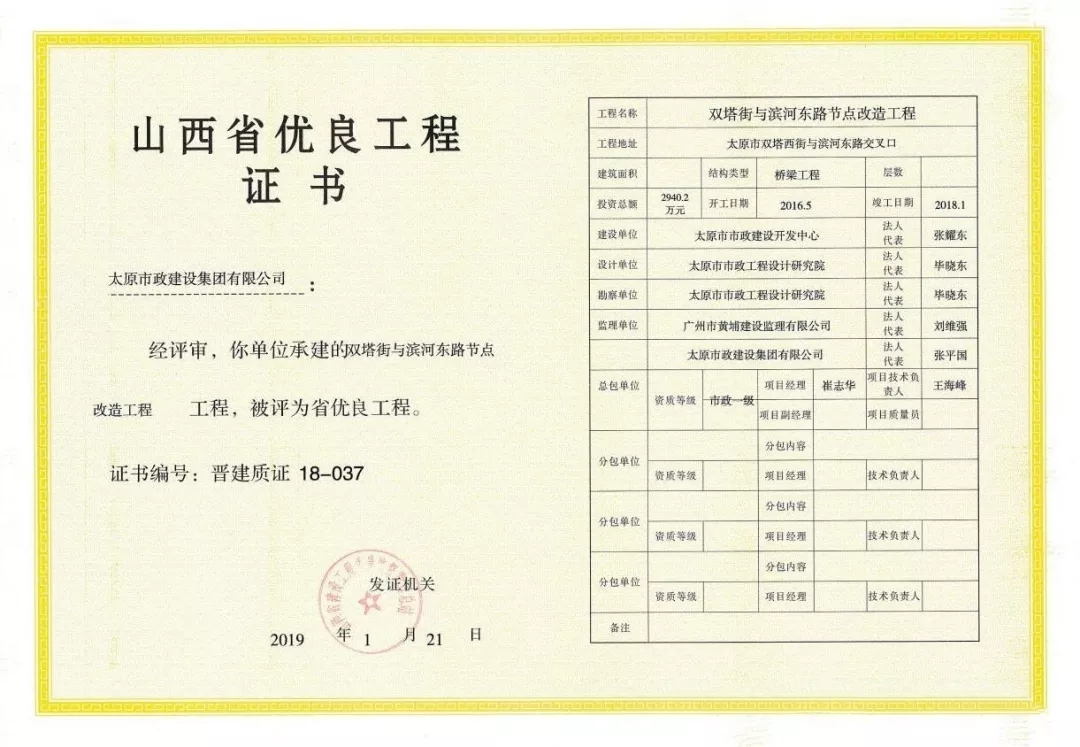 太原市政建設(shè)集團(tuán)有限公司雙塔街與濱河?xùn)|路節(jié)點(diǎn)改造工程榮獲“山西省優(yōu)良工程”榮譽(yù)稱號(hào)