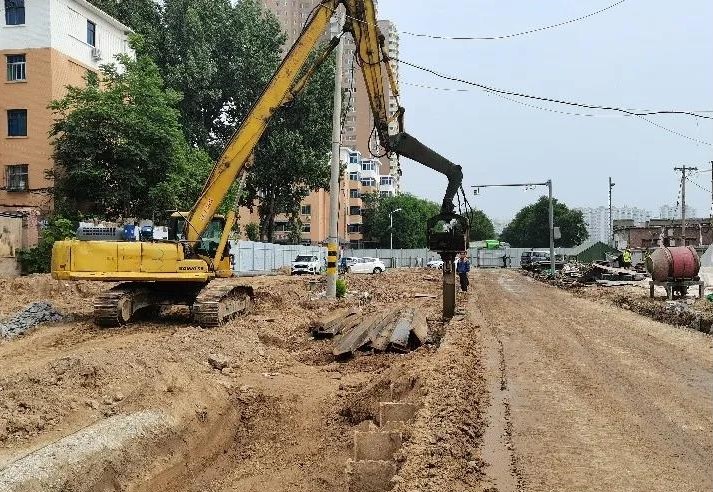除迎新街北段外,其他道路在溝槽開挖時(shí),都需要在施工過程中對老舊居民樓進(jìn)行保護(hù)。項(xiàng)目部經(jīng)過仔細(xì)研究后,決定在建筑物旁采用兩排高壓旋噴樁進(jìn)行隔離保護(hù),減少施工對老舊建筑物的影響,確保工程安全。面對地下管線復(fù)雜的情況,項(xiàng)目部積極聯(lián)系業(yè)主,多次與煤氣、自來水、供熱等公司溝通協(xié)調(diào),最終對影響施工的管線進(jìn)行改遷,為工程順利施工奠定了基礎(chǔ)。同時(shí),迎新西一條施工范圍內(nèi)有十余根高壓電線桿,緊鄰雨污水管,因電線桿短期內(nèi)無法遷移,若進(jìn)行溝槽開挖,存在極大安全隱患,為確保施工安全,項(xiàng)目部采用打鋼板樁的方式對電線桿進(jìn)行保護(hù),順利解決了施工難題。